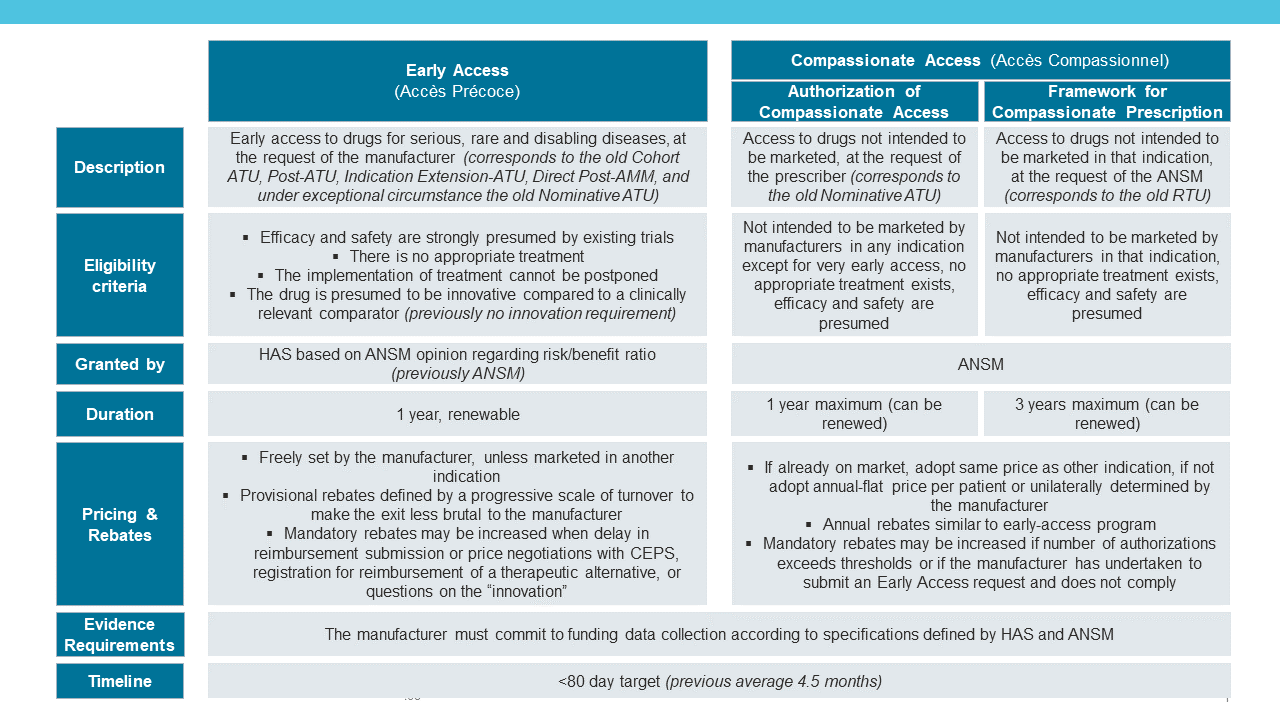 Over time, the ATU/RTU mechanisms have become more complex with the evolvement of different streams. This prompted a review by the French Social Security Law for 2021 (Loi de financement de la Sécurité sociale (LFSS) pour 2021 [4]) to simplify the system, to become more homogenous and to obtain a more financially sustainable solution. The ATU/RTU program, previously divided into 6 streams, will now become 2: Early Access (Accès Précoce) and Compassionate Access (Accès Compassionnel).